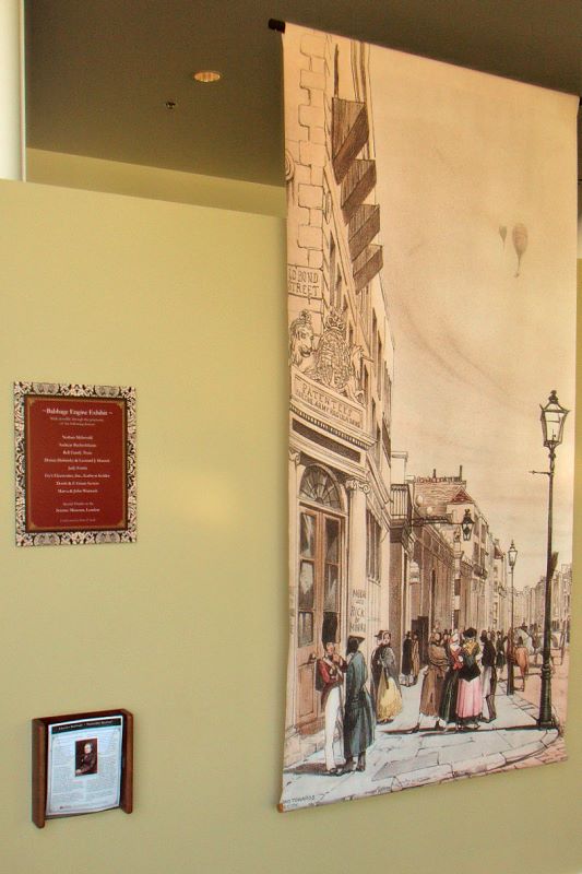 A wall hanging depicting a street scene from the 19th century gives a great bit of context for the Difference Engine and the man who designed it. There's a small graphic of the full picture visible
