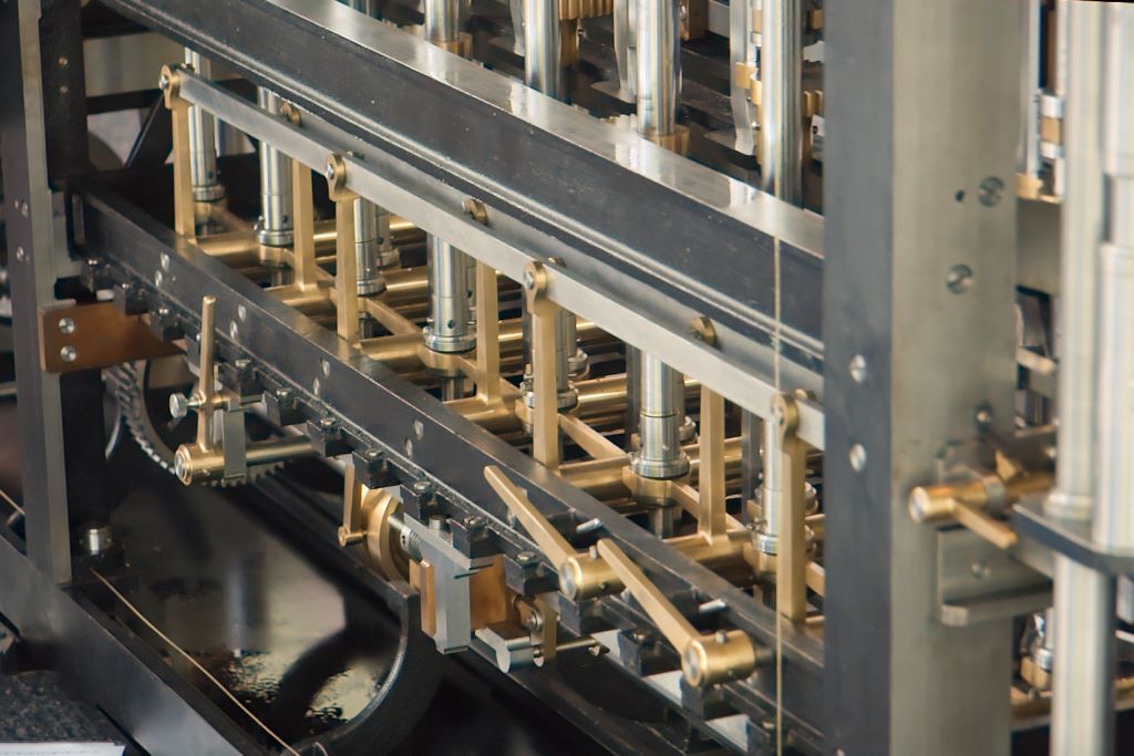 A closer look at the lower transmission section. You can see the seven drive rods going upwards to the seven accumulator registers.