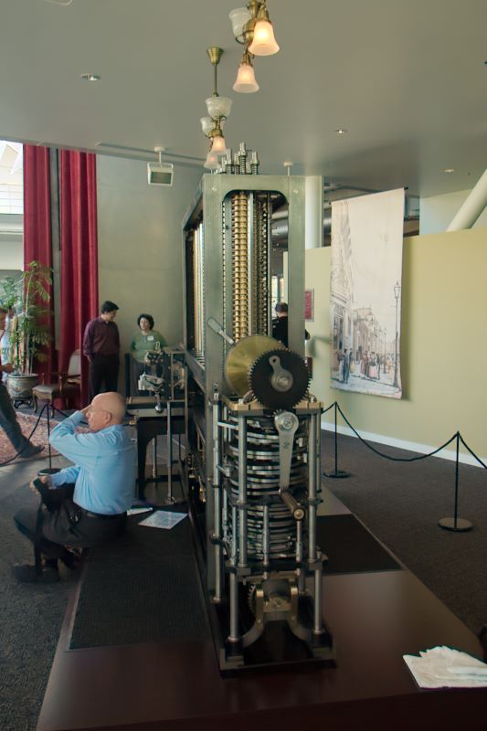 This is the other end view of the Difference Engine. It is a lot thinner than the other end. You can see the handle for cranking. Like the 1970s Cray 1, it is convenient to use your computing device as a place to sit and rest.