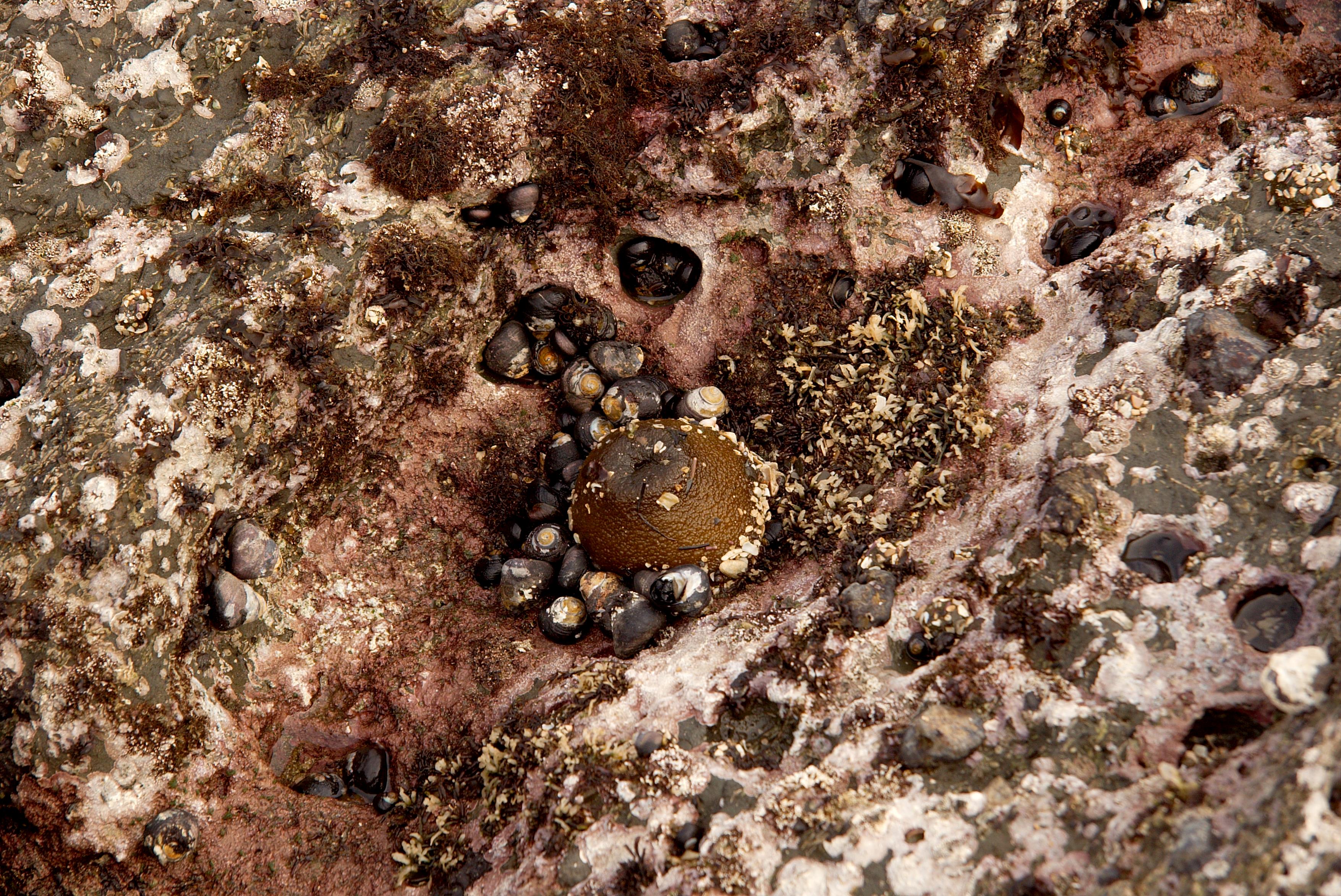 This is a Green Anemone out of water. It folds up and looks like a glistening brown blob. All the snails have clustered around it as the water retreated.