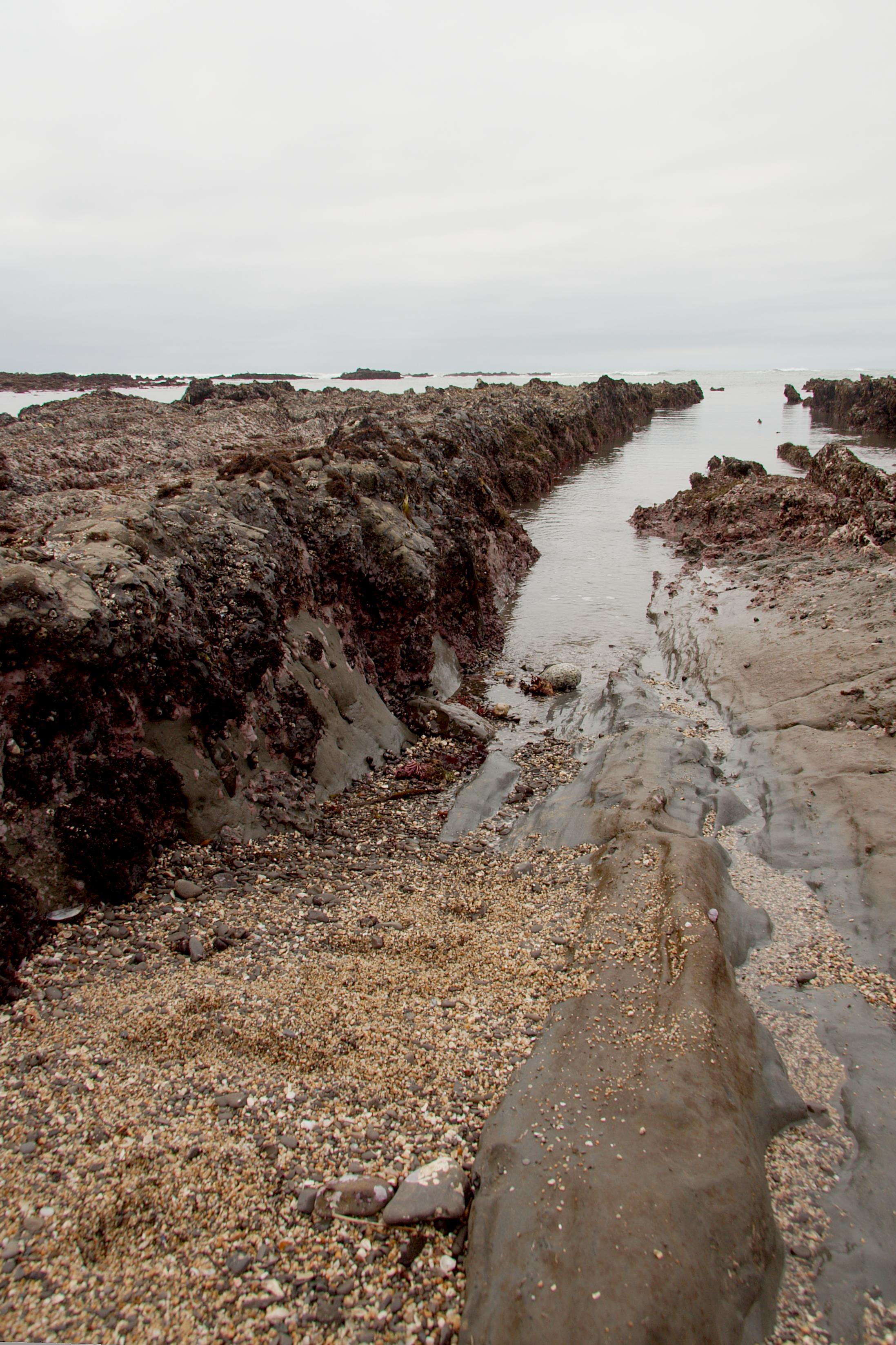 The tide pools consist of ancient craggy lava flows running out from under the sand and soil into the ocean.