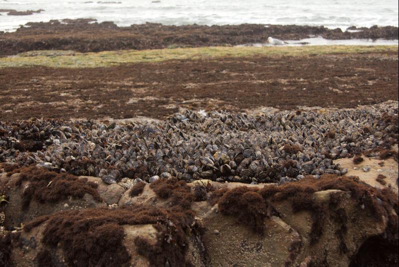 The rock drops away in the middle before the beach. Lets me get this view across some Mussels down to the waves.