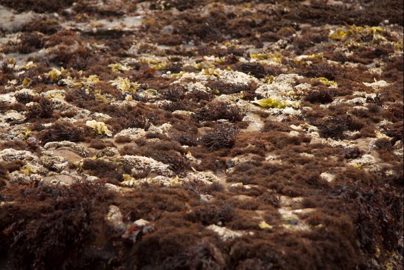 Interesting rock cover. Sea moss waiting for the water to flow back over.