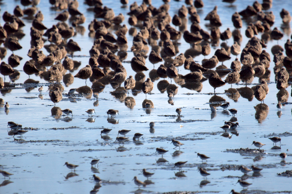 The small birds are sandpipers I think. They stay on the mud flats and scuttle after insects and small burrowing crustaceans. They moved around very quickly.